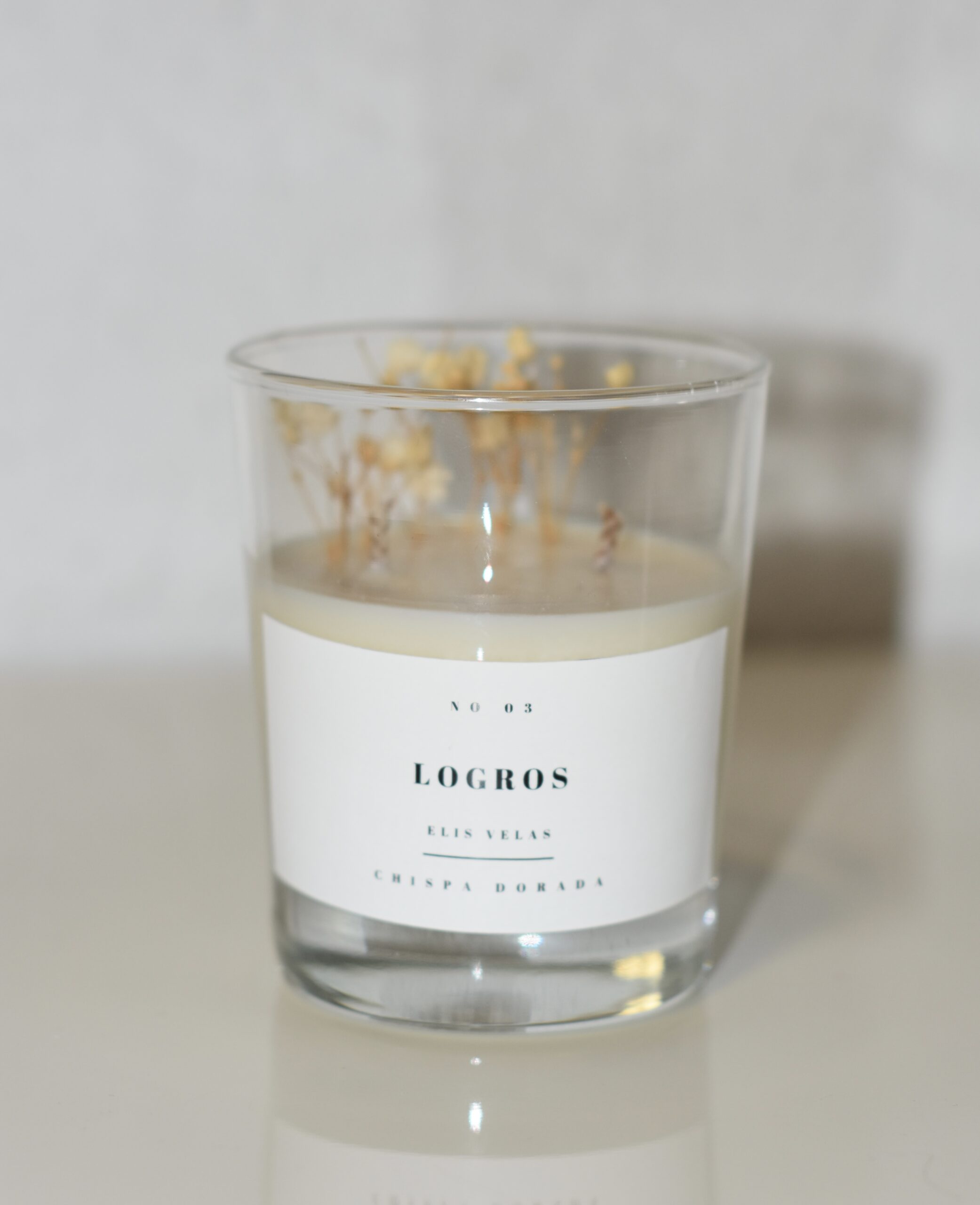 Vela Artesanal Logros. Hecha a mano con cera de soja natural. Aroma: Bergamota, un aroma que intenso que te llena de satisfaccion